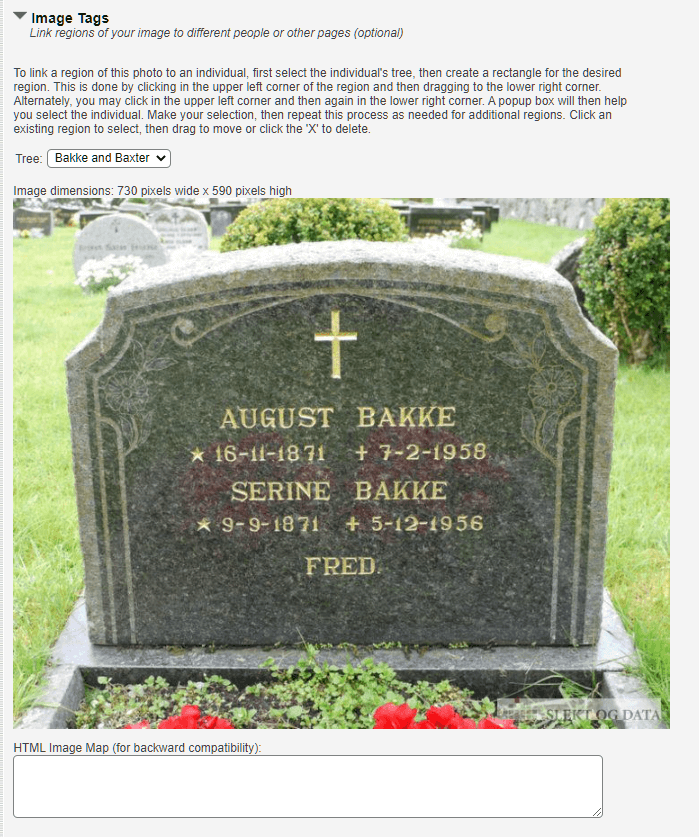 Last section is the image tags. Here you can tag an image to show exactly where that person is. Not a must on a gravestone unless you have several graves on teh same picture, then it can be good.