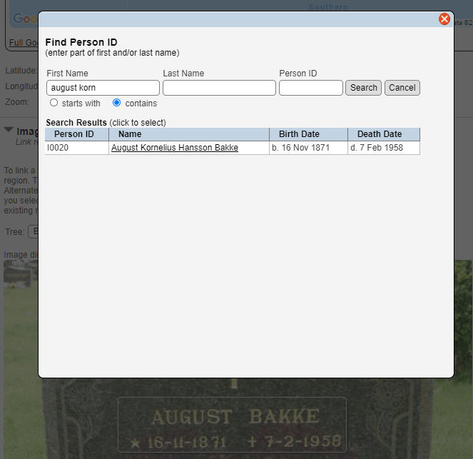 Above you will see we have one person already, on this example i want to add one more person that is on the same headstone, My great grandfather August. To add him i will look him up with the magnifying glass. ![]()